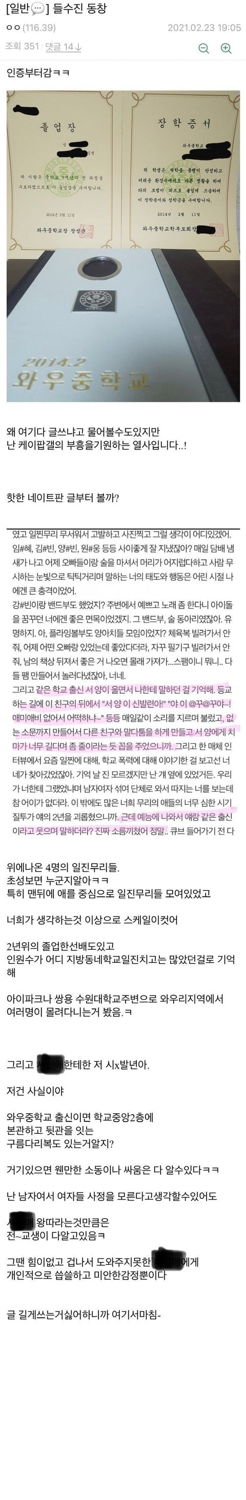 서신애는 학폭글올라온인물의 친구입니다 서신애,ㅈㅇㄹ,(글쓴이동생),ㅇㅇㅈ 라는친구랑 같이 다녔습니다