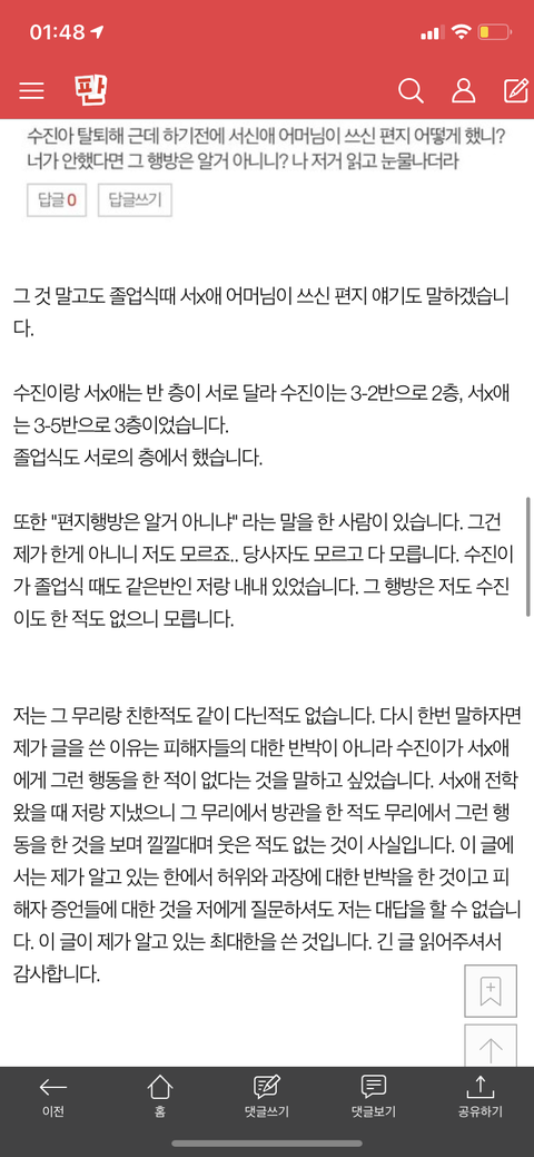 그러나 동창생의 글엔 2~3학년때에 모든 행동들이 서수진과 연관없는 그 일진 무리의 짓이라고 밝힘