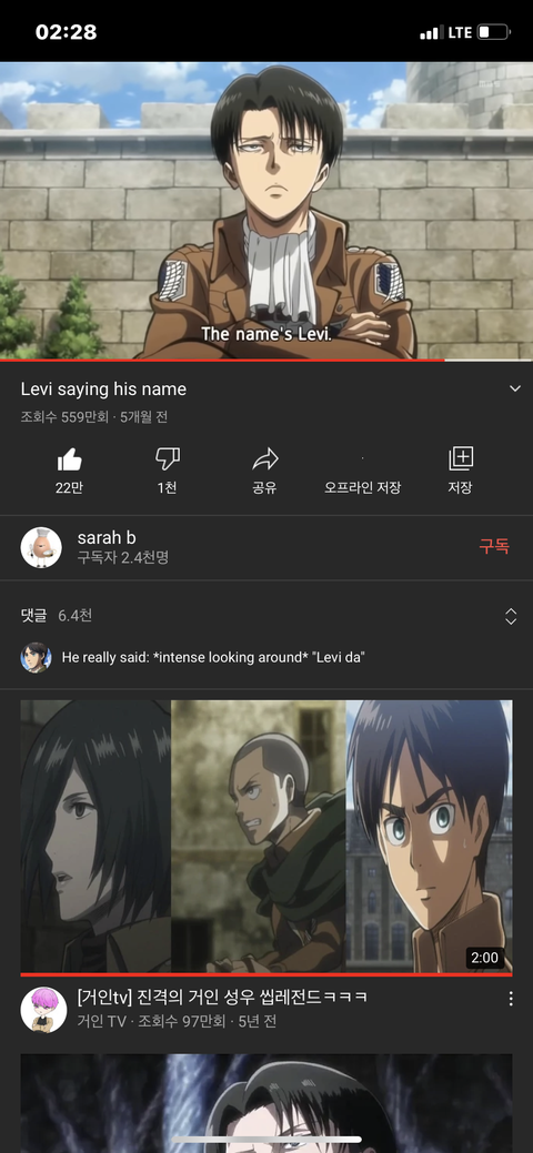 리바이는 이름 한번말해도 따봉 22만개나 받고..