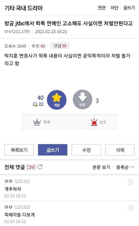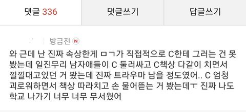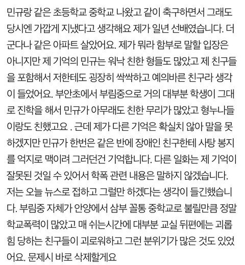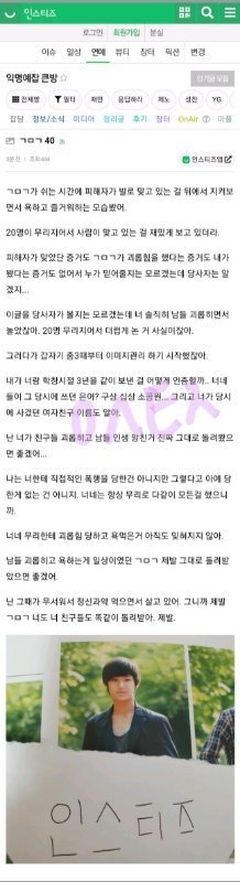 김민규 진짜 강약약강인 인간이었나봄..지금 나오는 폭로들도 다 보면 주동자 무리에 붙어서 같이 낄낄대고 히히덕대고...그와중에 자기는 '주동'한적은 없으니까 잘못한게 없었다고 생각하겠지? 학교폭력(왕따) 경험자로서 주동하는 ㅅㄲ들보다 너같은놈들이 제일 꼴보기싫고 빡쳤었어 ㅅㅂ ㅋㅋㅋㅋㅋㅋ 오늘중으로 입장문 내놓고 이 판에서 영원히 꺼져라