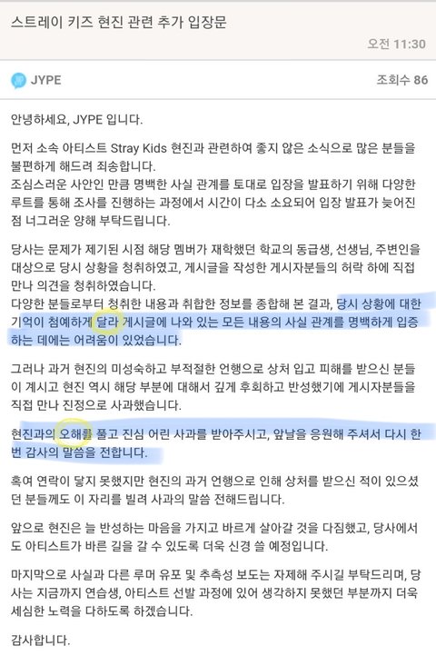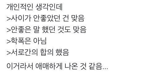 공입 애매하게 나왔는데... 확실한 학폭 얘기 없고 걍 언행 얘기만 나온 거 보면 학폭에 대한 정확한 내용에 대해 확인도 불가능하고 서로 싸웠고 걍 그거에 대해 푼 거 아냐? 공입에도 서로 기억이 다 달랐다고 했잖아 그리고 언행에 대한 일부분은 맞는데 학폭은 아니라 완전한 부정은 하지 못한 거고 일방적인 괴롭힘은 없었던 거 왜냐면 4일 기다린 것 치곤 너무 애매해서... 학폭이면 그냥 학폭 인정한다 쓰고 사과하지 않나? 너무 답답해서 글올려ㅠ