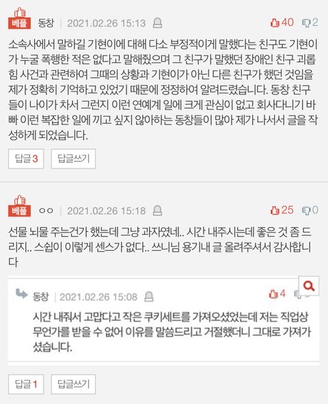이건 저 글 댓글인데 폭로자가 말했던 '스타쉽에서 동창들에게 뇌물을 주고 증언을 받았다. 증거가 있다' 라고 했던 뇌물이 증언에 대한 감사의 의미로 작은 과자세트를 의미하는 거였어