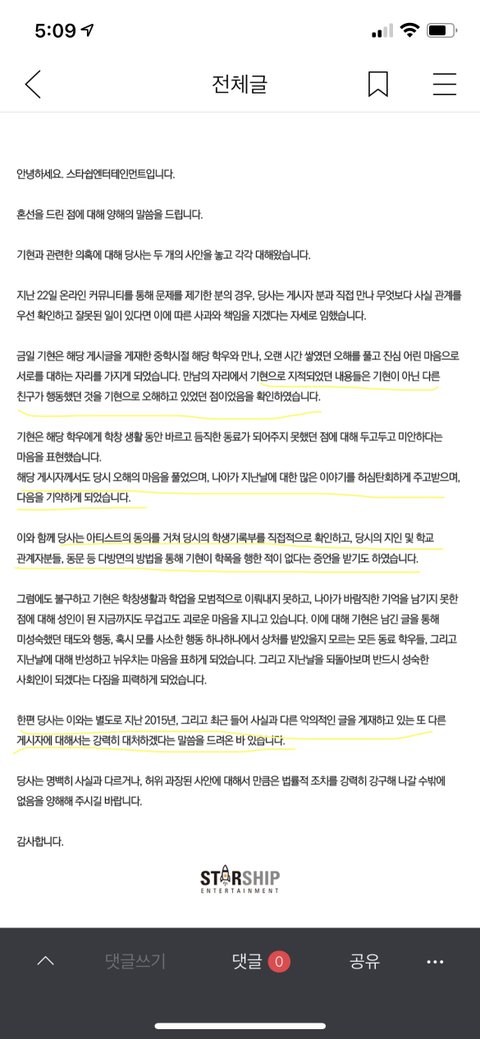 이건 방금 뜬 기현 학폭 관련 스타쉽 입장문이야