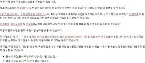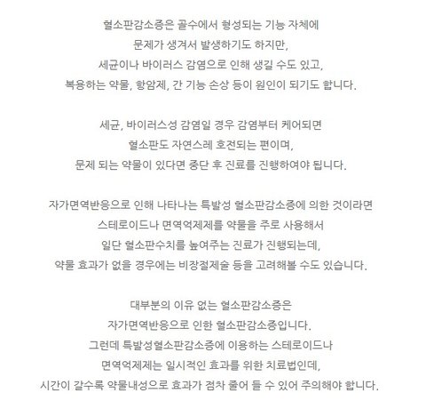 제가 찾아본 결과 원인이 간이나 비장 관련 문제가 많다고 하고 바이러스나 약물은 놔둬도 없어지거나 호전된다고 하며 이유없는 감소는 자가면역 질환이라고 합니다.