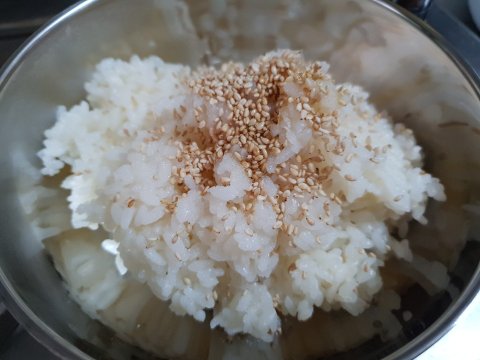 밥에 소금,참기름,깨소금 조금씩 뿌려 버무립니다김밥 간 하는거랑 같아요