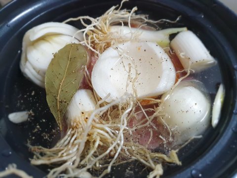 양파한덩이, 파뿌리 있음 넣고 없음 말고, 굵은후추 솔솔