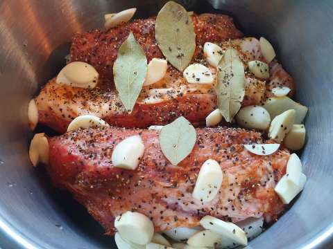 솥에 담고 그 위에 마늘과 월계수잎 넣고