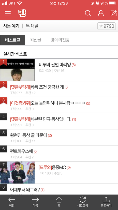 사는 얘기 들어갓는데 비투비가 떡하니 1위에 잇어서 기부니가 아zㅜ 좋은데 설마 저거 팬톡 아니지 나만 이렇게 기분 좋아하는거니 다른 멜디들 일상인 듯 아무렇지 않은거니 나만 세상과 동떨어져 사는거니