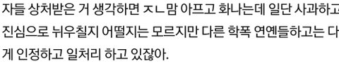 솔직히 황현진 같은 애들 중학교때도 많이 봤고, 또 남자새끼들 앞에선 안 그래도 단톡이니 얼평이니 뒤에서 얼마나 해재끼는데,,;; 피해자들 상처받은 거 생각하면 ㅈㄴ맘 아프고 화나는데 일단 사과하고 진심으로 뉘우칠지 어떨지는 모르지만 다른 학폭 연옌들하고는 다르게 인정하고 일처리 하고 있잖아.
