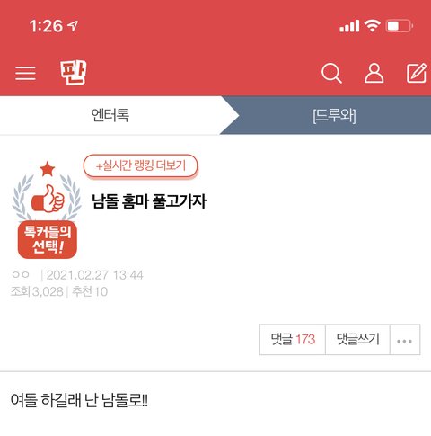 나 저기 댓 베플 됏다고 알림 떠서 들어가봣는데 저기 베플 덥뮤다에... 댓 보면 덥즈 사진 개많음 진짜 ㅠㅠ 그냥 덥즈 사진 푸는 곳임 ㅅㅂ ㅠ 아 웃겨