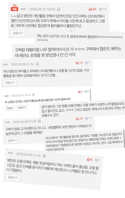 방탄은 빌보드 200 같은 유명 차트 1위도 하고 케이팝에 공헌 많이 한 월드스타인 건 알겠는데 굳이 명품 브랜드들 내려치기 하면서 자기들 가수 올려치기는 좀 아닌 듯...