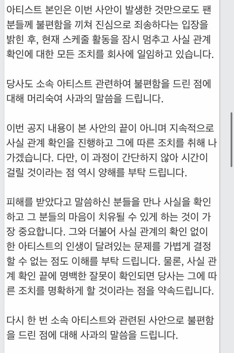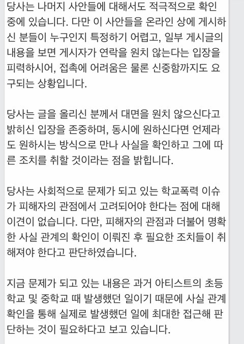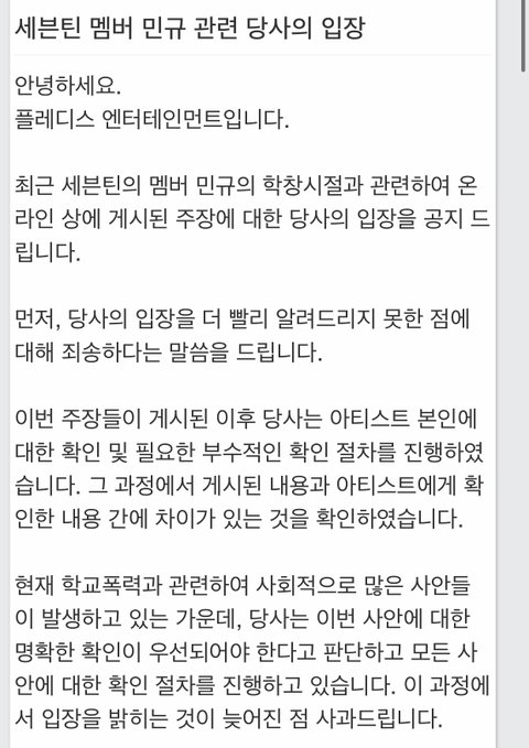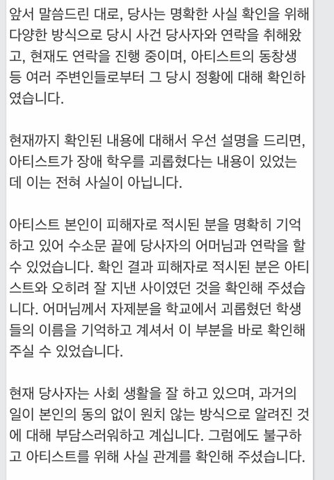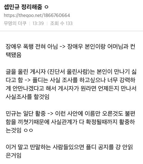 민규는 장애인 친구를 괴롭힌 적이 없다는 것만! 나온 상황이고 다른 내용에 관련된 공지는 추후에 나올 예정이니까 설레발 치면서 민규 학폭 아니라고 ❗️단정 짓지 않기❗️