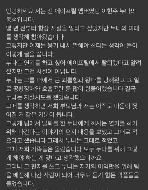 에이프릴 전 멤버 이현주 동생 폭로글 올라옴