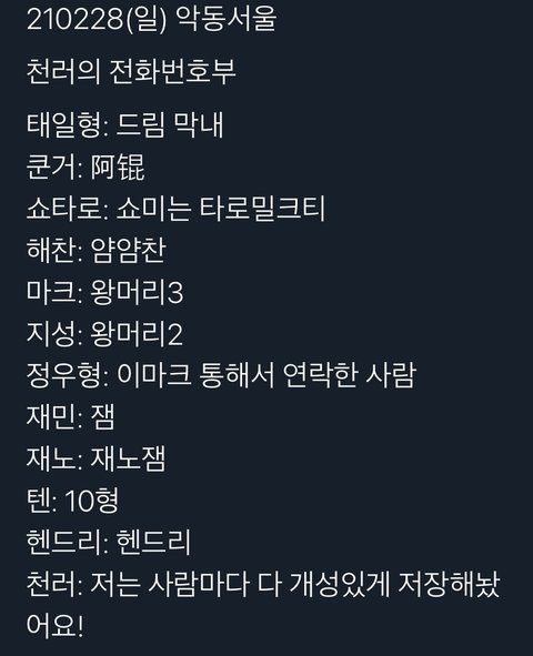 천러가 저장한 엔시티 멤버들 연락처 이름