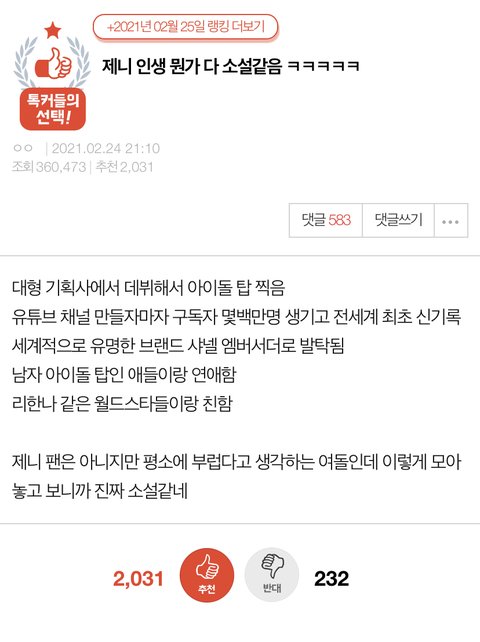 제목 미안 톡선에 추천수 2000넘어가는 제니 까글이랑 댓글들 보고 속상해서 나도 글 써봐 제발 제니 좀 그만 욕해 하유라잌댓 컴백하기 불과 한달전까지만 해도 발목 다쳐서 목발하고 다녔는데 티 하나도 없이 열심히 활동해준 제니야 그리고 온콘 본 블링크들은 제니 춤 대충췄다는 느낌 하나도 안받고 열심히 했다고 이번에도 레전드 찍었다고 난리였는데 왜 돈 하나도 안낸 팬들도 아닌 너희들이 더 난리야..? 너넨 그냥 제니가 싫어서 악플달고 있는 거 같아 그리고 제니가 다른 멤버들에 비해 체력이 부족해서 한 곡 하고 나면 힘들어하고 과호흡 자주 온다는 거 본 적 있어 그래도 무대에서 열심히 하는 거 보여 근데 쭉 대충한다니 뭐니 그리고 남친 만나고 왔느니 뭐래니 그런 댓글 많은데 증거도 없는 디스패치 입장일 뿐이고 만약에 그랬어도 그건 제니 사생활이야 1년 넘게 제니 사생활 캐고 다닌 디스패치나 너네나 뭐가 달라..? 너네 비난이랑 비판 잘 구별하고 댓글 달아 제발