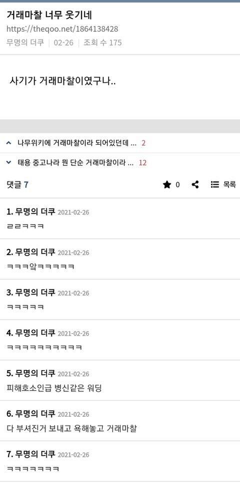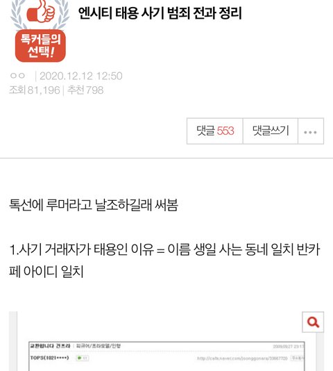 태용팬덤 수법이 중고나라 거래마찰이라 우기디가 사기피해자 정리해 올라오면 '몇년전 일로 아직 괴롭히냐'이거임. 대략 태용에게 사기당했다고 중고나라에 글 올린 사람만 7명이고 나도 저사람이랑 거래하다 사진안보여주거나 입금안하고 건담부터 달라해서 거파했다 이런 동조 합치면 10명 넘음