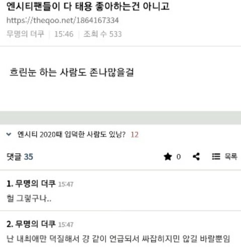 또 트위터에서 태용 팬덤이 워낙 타멤들을 까고 다녀서 트위터조차 선동된 트페메 까빠 급식(얘네가 주로 타돌 까고 다니는 똘추인데 태용은 절대 안깜) 걔네말고 진성팬들은 다 태용팬한테 시비 털려봐서 다 태용 관심없고 안좋아하는 편임