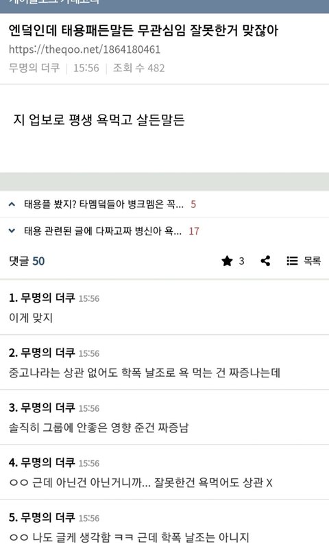 반카페에서 다른반 여자아이한테 몸평 제일 첫플로 이름까지 불러가며 달아서 그밑에도 그 여자애 조롱으로 달리게 유도함 이건 태용팬들도 인정한 사건임 비록 '댓글 하나'가 죄냐고 주장중이지만 댓글 두개고 얼굴 공개사진에 이름,인신공격한 범죄임