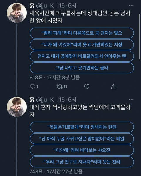 트위터에서 유사투표 가끔 뜨는거 할때마다 너무 재밌어.. 팬톡에서 우리끼리 해봐도 재밌을 것 같아.. ㅋㅋㅋㅋ 과몰입즈니....ㅋㅋㅋㅋㅋㅋ