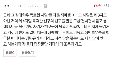 그 글을 믿는다는게 말이 됨? 나도 처음엔 믿었는데 장애학우 괴롭힌거 주작이라는 말 듣고 개 얼척 없어서 이 글쓴이는 거르려고 ㅋㅋㅋ 팬 아닌데 알지도 못하면서 실제 학폭피해자한테 (민규는 안 했지만) 또 피해준거 짜증남