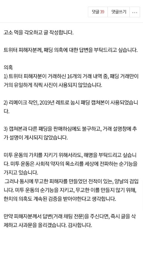 어느 누가 일반인인 제 당근계정 쥐잡듯이 잡아 털고 '16개의 거래 내역', 트위터 패딩글쓴이 당근계정 찾았다면서 댓글로 공유한 상황에 계속 올려두는것은 아니라고 판단했습니다.