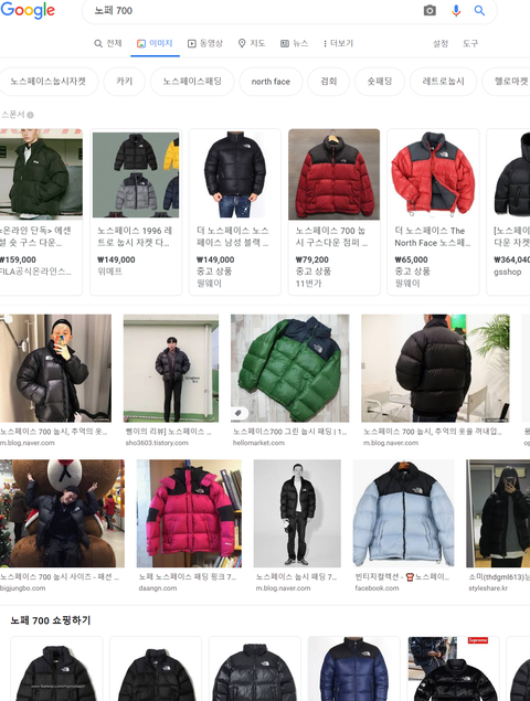 그래서 구글과 네이버를 검색했고, 노스페이스 700 을 검색하면 위의 이미지와 같은 패딩들이 가장많이 나옵니다. 가장 많이보이고 비슷한 제품의 사진과 이름을 기재했습니다.