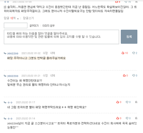 소수의 사람들때문에 왜 제가 계속 신경쓰고 반박해야하나요? 별 거지같은 문화를 다 보겠네 어차피 꼴보기싫어서 다 주작이다 의혹이다 똑바로 해라 그럴꺼면서 아따 저도 배째세요 같이 법정에서 보던가요
