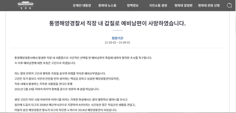 통영해양경찰서에서 발생한 직장 내 괴롭힘으로 극단적인 선택을 한 예비남편의 죽음에 대하여