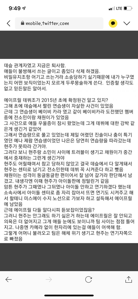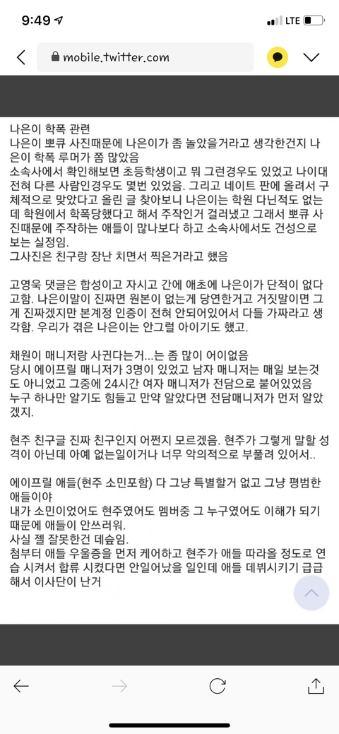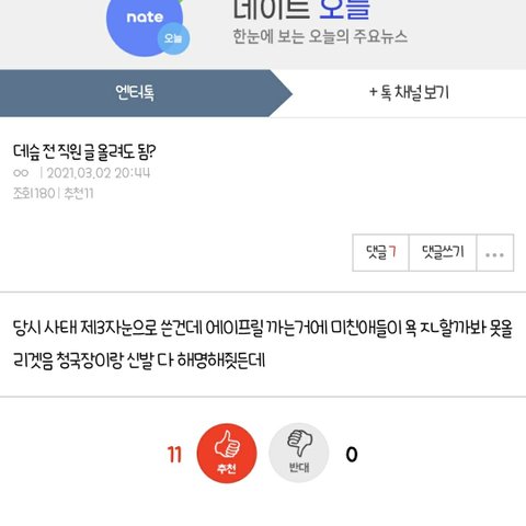 저딴글 올리면서 중립박으라고? 애초에 에이프릴옹호하는 글밖에없는데? 마지막사진 에이프릴쪽 에이프릴 스텝 기획사 지인 이런식으로 써놓은사진인데 저건 개소리아님? 에이프릴 이현주 같은기획사인데 이현주 입장표명 안내주고 에이프릴 입장표명만 내자나 기획사 자체가 그리고 에이프릴지인? 4~5명인데 그럼 1명이랑 4~5명 지인이랑 인원수가 같아야하나? 4~5명이 더많은건 당연한거아님? 중립박아라 중립박아라 하는데 솔까 박을수가없게 만들자나 기획사놈들이 중립박을수있게 양쪽 입장표명 같이내주던지 이미 기획사가 오해라는식으로 계속 언플하는와중에 중립박으면 이현주쪽에는 누가 힘이되줌? 기획사? 스텝? 지금 아무도 안챙기자나 에이프릴만챙기자나 그럼 이현주가 버틸수있을거라생각해? 이러면 본인이 왕따를당했어도 안당한걸로 바뀌는건 한순간이다? 지금까지 이 사건이 여기까지올수있던건 솔까 네티즌힘 아니냐? 애초에 관심없거나 이상황에서 중립박아봐라 아예 에이프릴 좋은쪽으로 기사 계속나오겠지 이런건 네티즌한테따질게 아니라 기획사한테 따져야되는거아니냐? 기획사가 이런식으로 나올수록 사람들은 반감만 가져 그냥 다 터놓고 제대로된 둘입장을 내뇌야