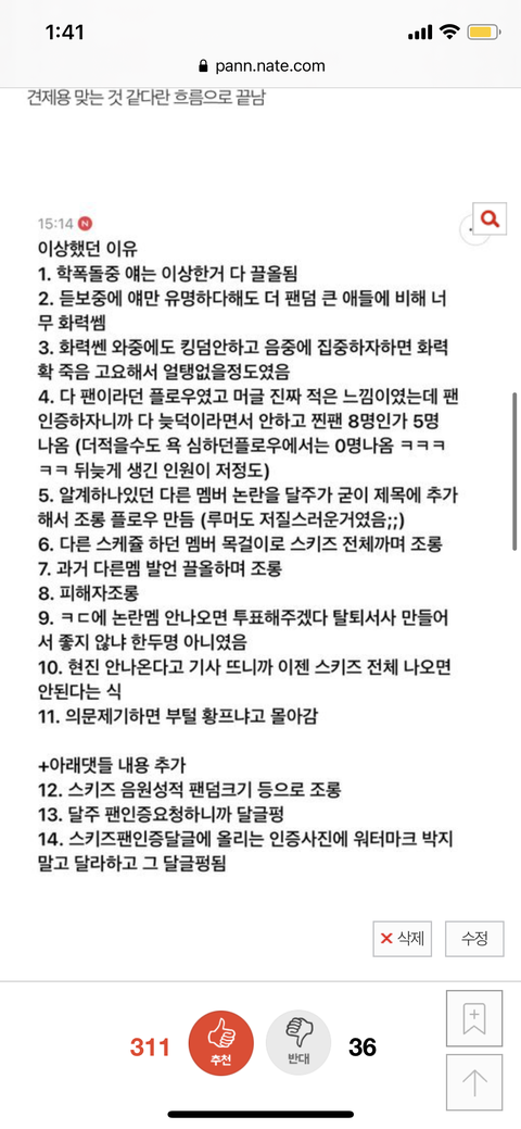 +) 이시간 되니까 어그로들 슬슬 기어나와서 지웠다 어그로뿐만 아니라 하루동안 톡선에 있었으니까 볼사람은 충분히 다 봤고 우리가 전달할 내용은 전달된거 같아서 지웠어