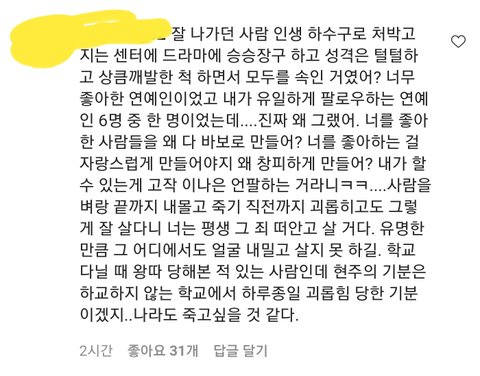 나 진짜 중1때 은따만 당했을 때도 너무 힘들었음 애들 눈치 조카 보이고 그거때문에 학교도 아프다 하고 두달정도 안나감 이현주는 오죽할까