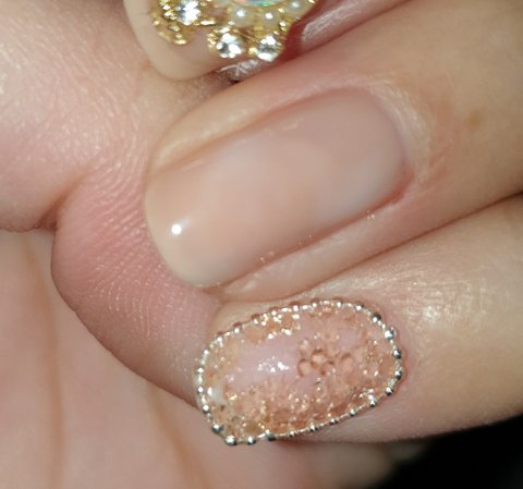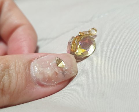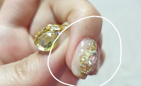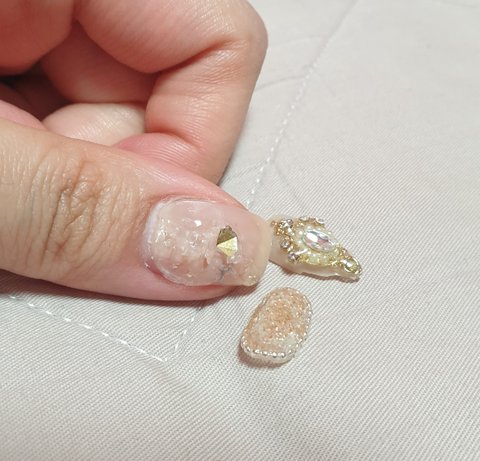 네일을 받는 와중에도 2번이나 피가 나고 점점 사진 속의 디자인과 멀어지는 것 같아서 불안불안했었는데 네일아트를 다 받고 5일만에 손톱이 떨어져나가고 사진처럼 시술한곳들이 다 떨어져 나갔습니다