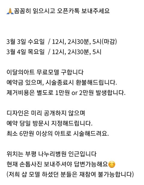 지금도 네일아트모델구하시는데 이젠 예약금을 다시 돌려드린다고하네요..!!ㅎ