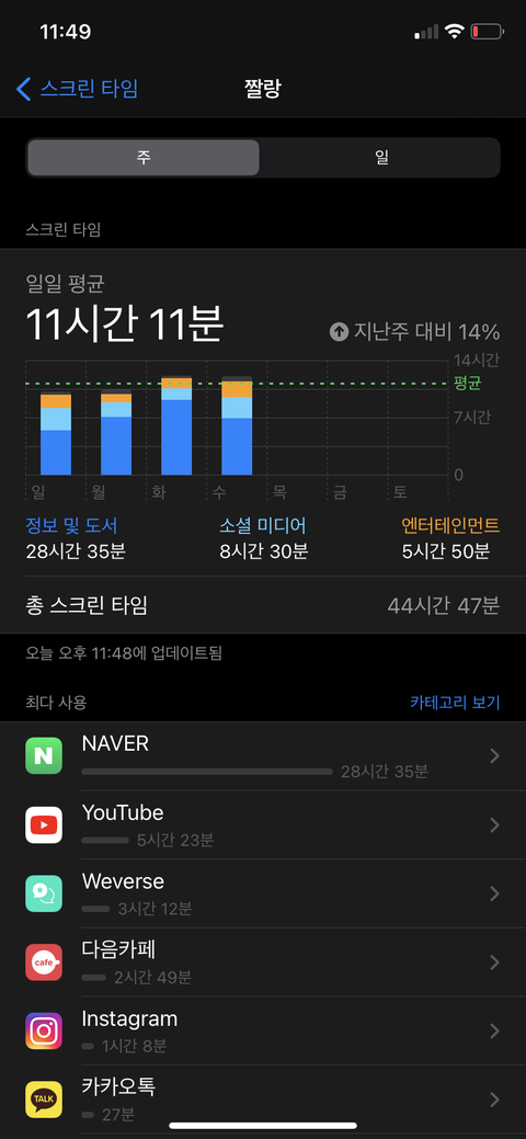 나 판 네이버로 하는데 일주일 동안 카톡은 고작 30분 들어가고 판에서 28 시간을 살았네.. 현생은 개나줘버려..