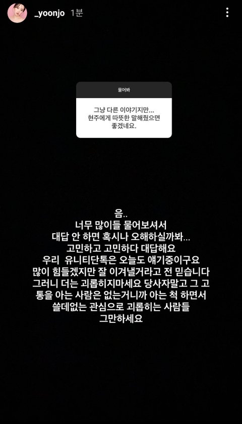 이분도 유니티 멤버였던 윤조님. 현주 관련 질문이 많이 올라오자 저렇게 답하셨음. 웃긴게 같은 소속사 계열은 오히려 고소한다고 난리인데 유니티 멤버들은 오히려 응원해주고 다독여줌. 이러니 현주가 유니티를 더 애정을 가질 수밖에 없음.. 나는 이 조합들 찬성이야.