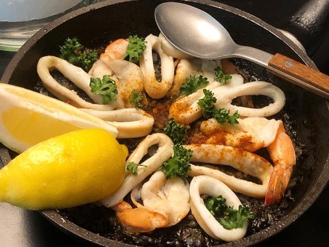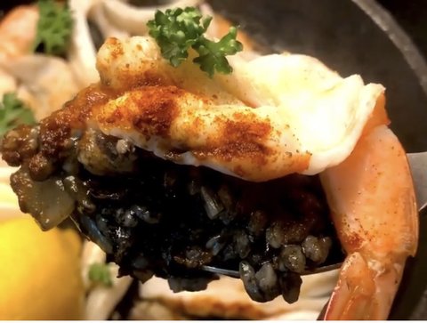 조개살 새우 오징어를 넣음 먹물 빠에야