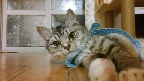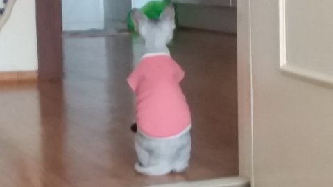 등 꼬리에 학대당하고 상처가 있었는데 넥카라 힘들어해서 제 레깅스 종아리부분 잘라서 옷만들어서 입혀놨어요.