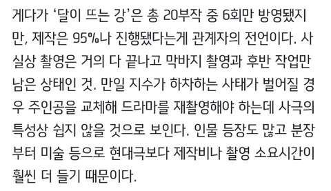 근데 여기에서 끝나는 게 아니라 달이 뜨는 강은 95% 촬영 완료 (회차로 치면 18회까지 촬영 완료) 후반 촬영과 후반 작업만 남았음. 근데 방금 하차 기사가 떴잖아. 그럼 남자 주인공을 보통 교체해 다시 찍음.