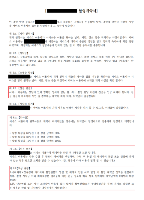 촬영 한달 전 완납이라는 것에서부터 빡쳤는데, 계약서 내용조차 이렇다니.