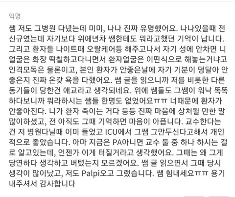 그 때 그 선생님이 결국 중환자실에서 오래오래 잘 계시다가 교수님이 되셨다는 소식에 왜 이리 눈물이 나는지 모르겠어요,