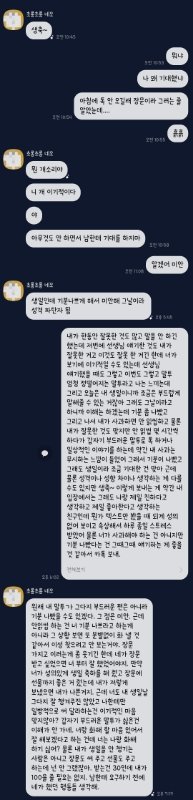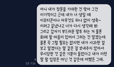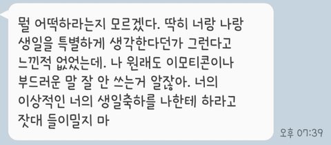 근데 성격이랑 성향이 좀 달라 물론 mbti로 모든 성격이나 성향 사람의 특성이 다 갈라지는 건 아니지만 이야기 하자면 나는 infp인데 상황에 따라 e가 나올 때도 있고 이 친구는 estj인데 가끔 enfj가 나올 때도 있어 진짜 이러고 보면 어떻게 친해지고 그랬는지 모르겠는데 암튼 오늘이 내 생일인데 얘랑 나랑 싸운 톡이야 꼭 읽고 의견 좀 남겨줘 그리고 나는 이 친구랑 계속 친한친구로 지내고 싶어 진짜 댓글로 의견 꼭 부탁해ㅠㅠㅠㅠㅠㅠ