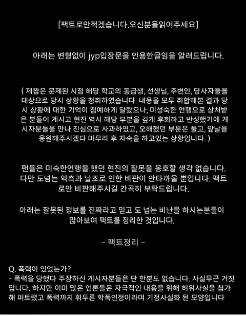 +자꾸 또 짤 빼먹었다고 물타기 하길래 현진팬들이 자랑스럽게 들고다니는 쉴드짤 추가함 언어폭력도 학교폭력임 현진팬들아 피해자글 보고 양심이 있으면 학폭 아니란 물타기는 그만해라 제발 2차가해 엄청나네 신체적 폭력보다 언어적 폭력이 더 정신적 피해가 클 수 있단걸 모름??? 폭언도 학폭 범주임 뭐가 자꾸 학폭이 아냐 이런 쉴드글 올려놓고 당당하게 나대고 다니는게 어이없음 읽어보면 아예 말이 안되는 교묘한글인데