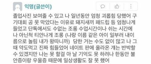 이런짤 만들어서 학폭 피해자 한명만 나온것처럼 교묘하게 주작 쉴드글 퍼트리고 다니네 폭언도 학폭임 요즘 학폭예시도 모르는 아줌마들만 붙었나봐