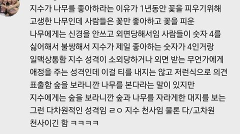 사람들이 꽃들만 좋아해줘서 나무를 사랑하고, 사람들이 숫자 4를 너무 싫어하는 걸 불쌍하게 여겨 최애 숫자가 4인 지수...