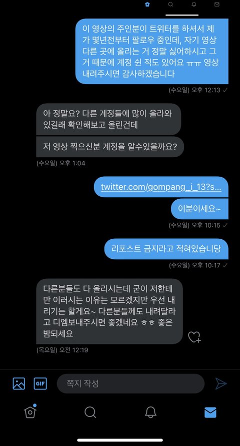 사진 그대로 ㄱㅁ섹ㅌ봇이 있는데 거기에 내가 옛날부터 아시는 분의 영상이 올라와있는거야 근데 그분이 불펌에 되게 예민하시고 리포스트 금지라고 엄청 적혀있어서 내가 ㅅㅌㅂ님한테 내려달라고 정중하게 요청했는데 개비꼬아들음... 내 잘못이냐 이런거 올려서 미안