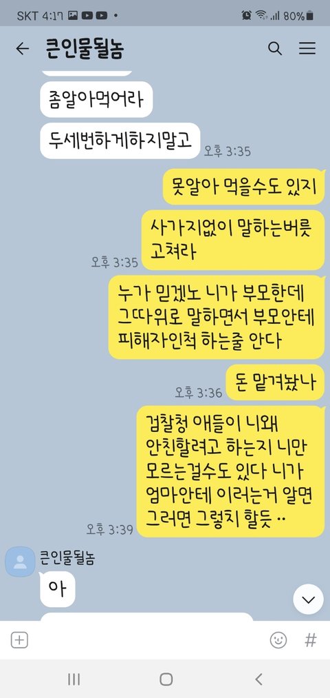 그때마다 저한테 저렇게 카톡을 보내서 토로합니다... 솔직히 제가 할 수 있는게 뭐가 있나요?,,.. 부모님이 변하셔야지.. 애가 변하던 말던 하죠,...