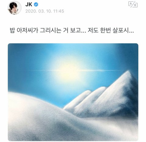 참고로 정국이 그림 따로 배운적 없음.. 유튜브 보는게 전부임 ㅜ 그것보다 그림 그릴때 소재 매번 보라색 구름 보라색 나무 이렇게 팬들 생각하면서 그려주고 마이크도 보라색 인이어랑 손에도 아미로고 요즘 끼고다는 링 귀걸이도 보라색 귀걸이ㅠㅠㅠㅠ무심한데 ㅈㄴ따뜻하지않니 정국이 ㅠㅠㅠㅠㅠㅠㅠㅠㅠㅠㅠㅠㅠ