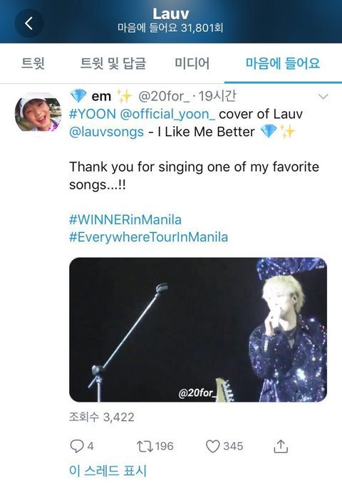 그리고 Lauv라고 다들 아니? 나 이 분 진짜 너무 좋아하는데 강승윤이 I like me better 라는 곡을 콘서트에서 짧게 부른 영상이 돌아다녔는데 이게 또 라우브님한테까지 가버림
