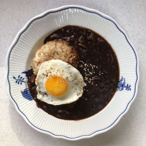 짜장밥! 그릇이랑 너무 잘어울리고 계란이 뽀인뜨라서 귀여움 ㅠㅠ 계란 노른자 톡 터트려서 비벼먹으면 꿀맛..