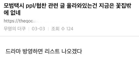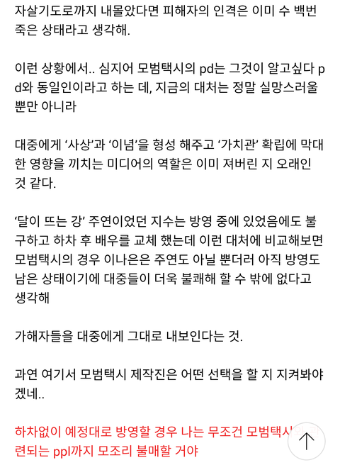 SBS랑 모범택시 측에서 시청자 게시판 확인을 전혀 안 하나 봐 내가 어제 낮에 전화했을 때 하차 논의 전혀 없고 하차 요구도 금시초문이라는 반응이더라!! 하차 요구 전화도 처음 받아본다고 했어!! 다들 시간 되면 SBS에 하차 요구 전화 한 번씩만 부탁해!!!